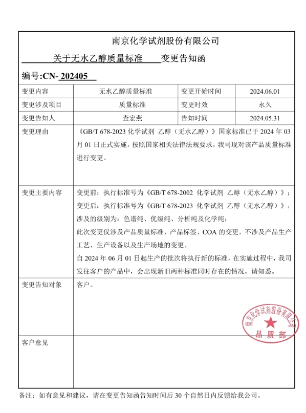 南京化學(xué)試劑股份有限公司,6.1號(hào)起,對(duì)于無(wú)水乙醇質(zhì)量標(biāo)準(zhǔn)進(jìn)行變更,詳情如下: