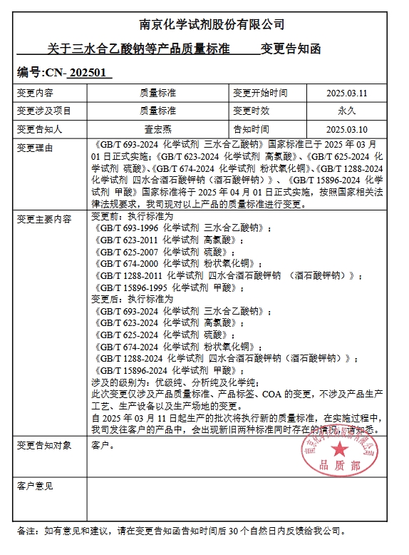 化學(xué)試劑三水合乙酸鈉、高氯酸、硫酸、粉狀氧化銅、四水合酒石酸鉀鈉、甲酸等六個(gè)產(chǎn)品質(zhì)量標(biāo)準(zhǔn)更新,此次變更涉及的級別有優(yōu)級純純、分析純和化學(xué)純,實(shí)施過程中會出現(xiàn)兩種標(biāo)準(zhǔn)號的產(chǎn)品!變更日期2025年03月11日,詳情如下: