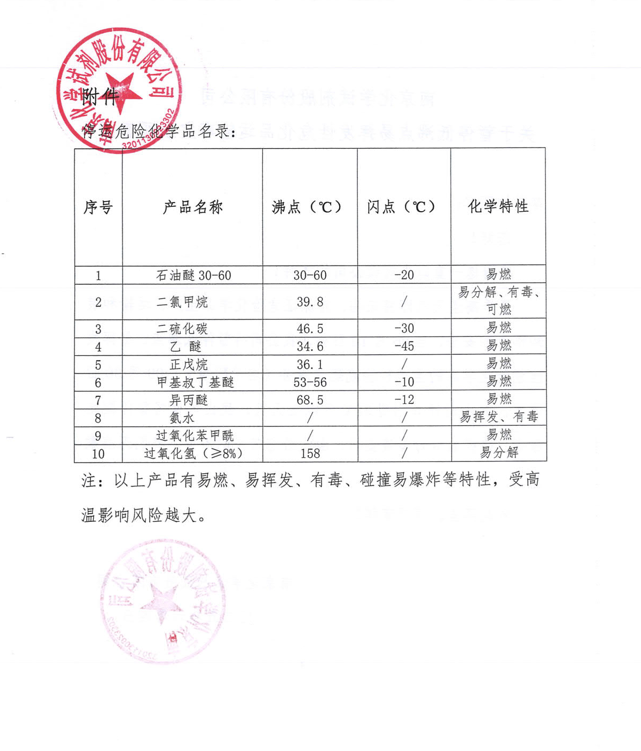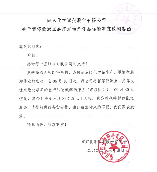 尊敬的顧客:您好!感謝您一直以來對我公司的支持!夏季高溫天氣即將來臨,為保證危險化學(xué)品生產(chǎn)、運輸和裝卸作業(yè)的安全,自 06 月 10 日起,南試公司將暫停低沸點、易揮發(fā)性危險化學(xué)品的生產(chǎn)和物流配送服務(wù)(名錄附后),預(yù)計 09 月30日恢復(fù),其余時段如出現(xiàn) 32℃及以上天氣,我公司也將暫停配送服務(wù)。請請?zhí)崆白龊脗湄洶才?,由此給您帶來的不便,我們深表歉意。詳情如下: