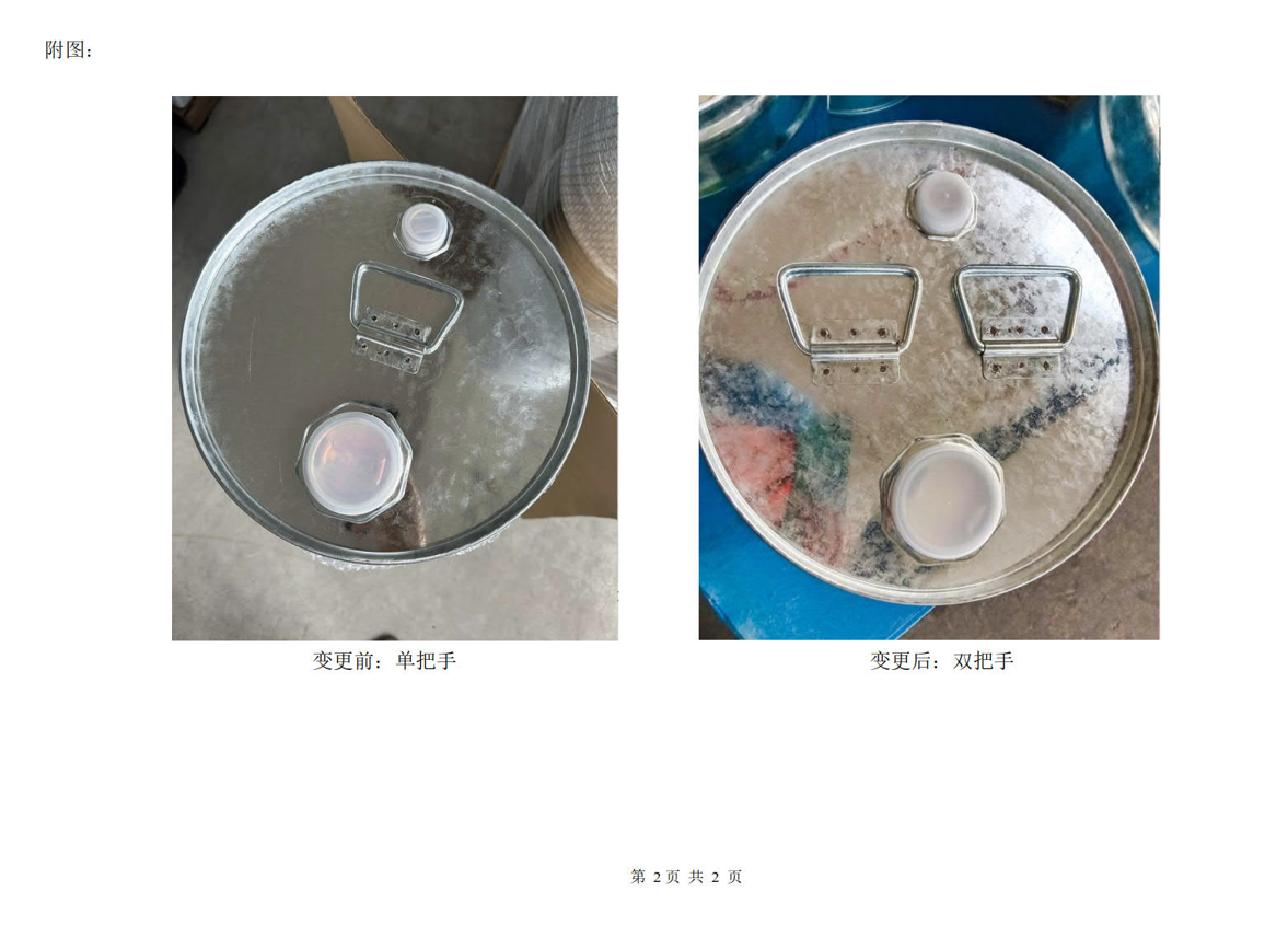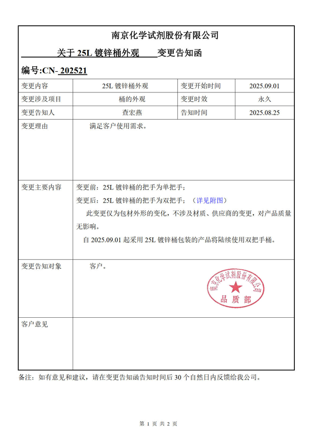 根據(jù)客戶的使用需求,南京試劑:25L鍍鋅桶外觀由單把手變更為雙把手,從9月1日開(kāi)始陸續(xù)使用雙把手桶,此變更僅為桶的外觀變化,對(duì)產(chǎn)品質(zhì)量無(wú)影響。變更告知函請(qǐng)?jiān)斍槿缦拢?/span>